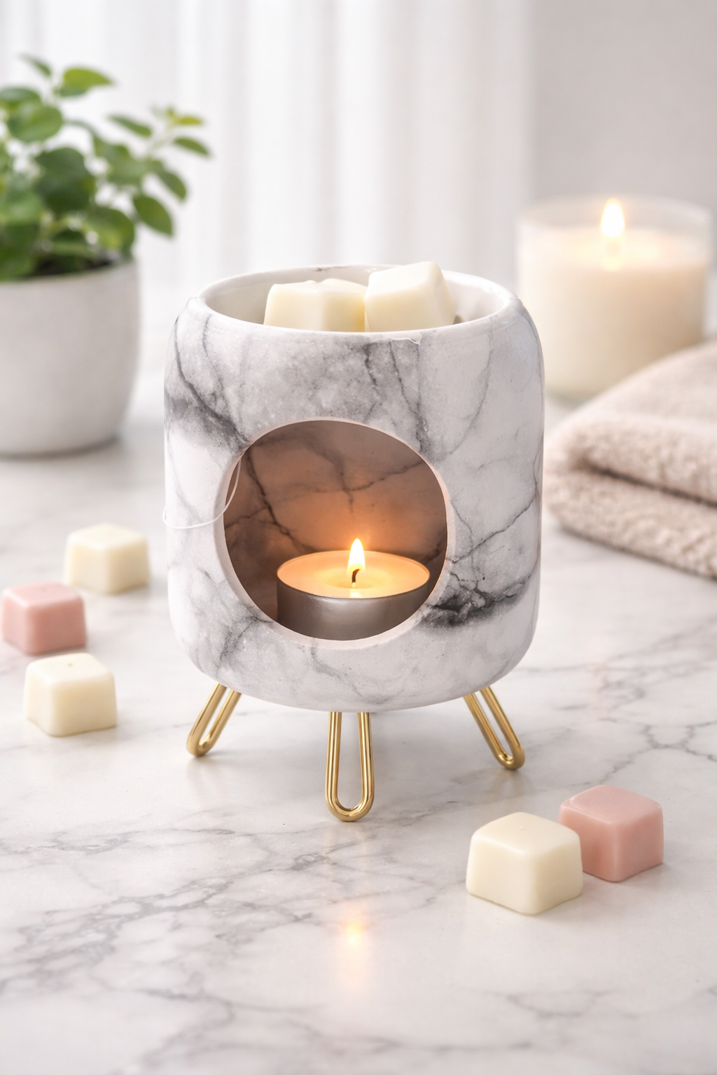 Apportez une touche de raffinement et de douceur à votre intérieur avec le brûleur de fondants Marbré Élégance. Son design moderne effet marbre, associé à des pieds dorés élégants, en fait un véritable objet de décoration tout en diffusant délicatement vos parfums préférés.